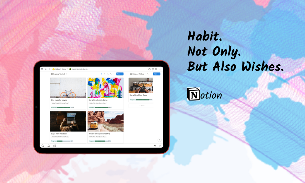 Notion Habit (Not Only, But Also Wishes) is a very unique yet direct and effective way to help you track your habits and fulfill your wishes.