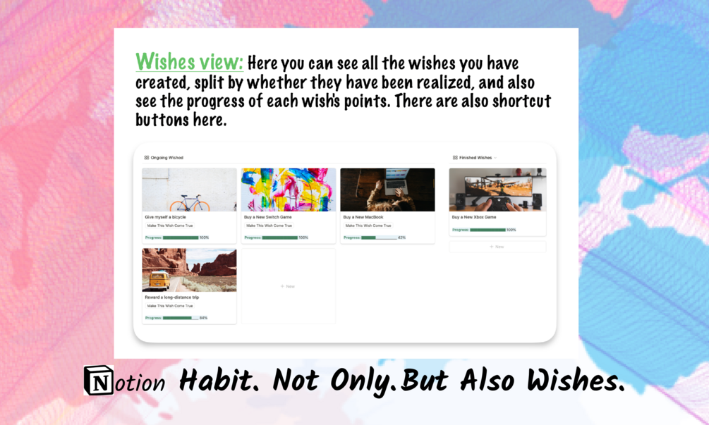 Notion Habit (Not Only, But Also Wishes) is a very unique yet direct and effective way to help you track your habits and fulfill your wishes.